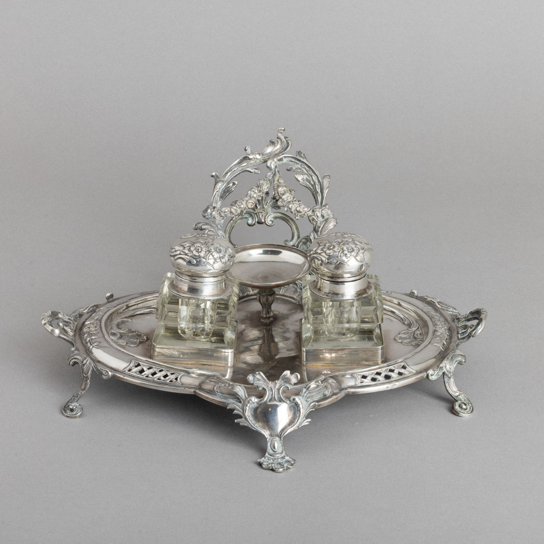 Em prata portuguesa contraste javali (1887-1937) de 833, decoração relevada e vazada "flores e elementos vegetalistas", tinteiros em cristal (ínfimas esbeiçadelas). Sinais de uso e suporte das cartas com falha no apoio. Peso aprox.: 603 g. (só prata) Dim.: 11x28x31 cm.
