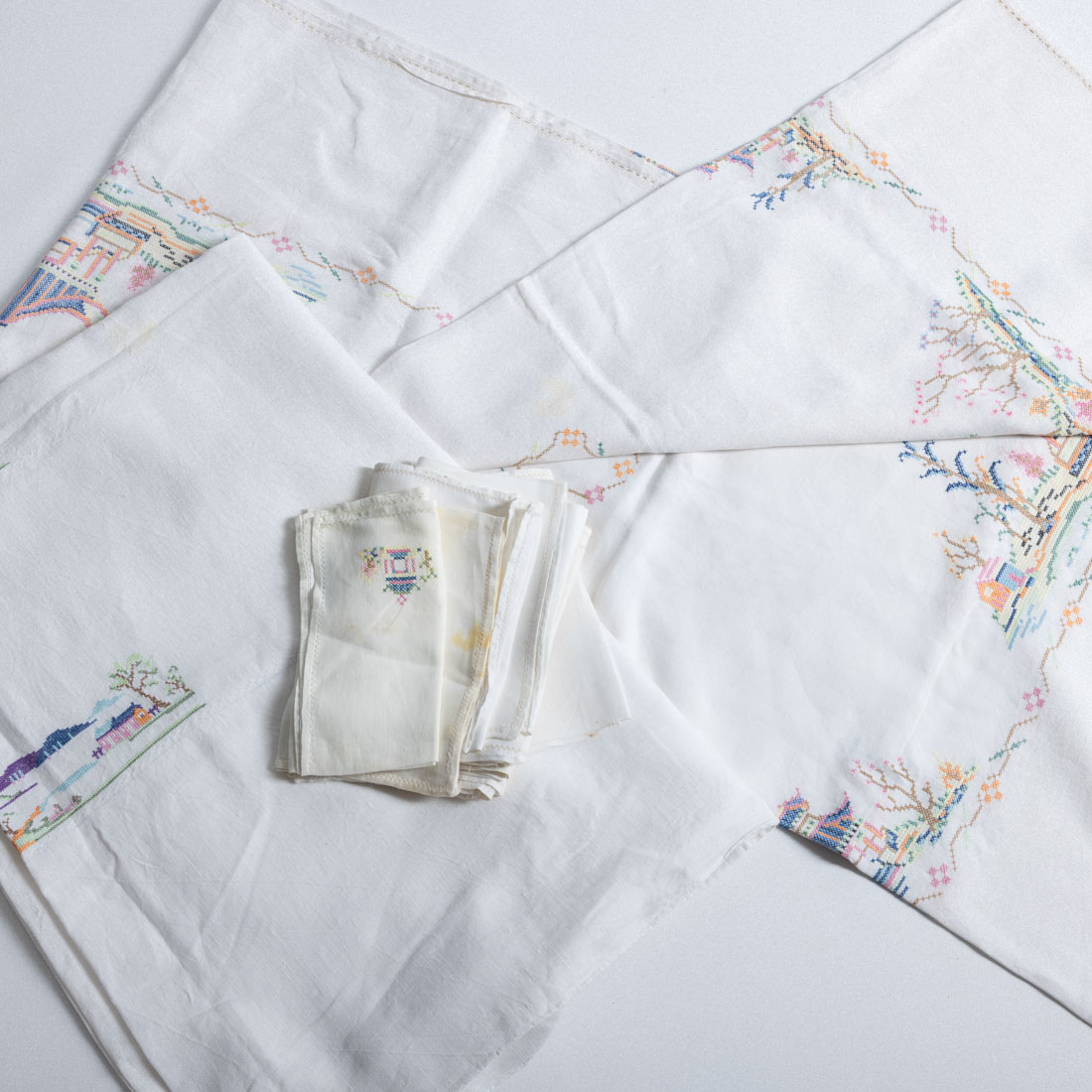796. DUAS TOALHAS DE MESA, UMA COM DEZ GUARDANAPOS