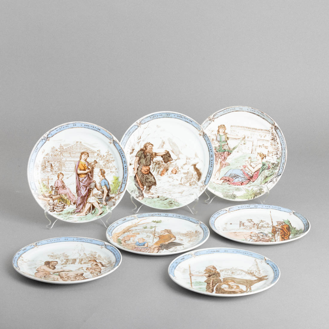 Em loiça pó de pedra francesa, decoração policromada "Exposition de 1889, Histoire de l'habitation, Champs de Mars, Paris". Sinais de uso e ínfimas esbeiçadelas.