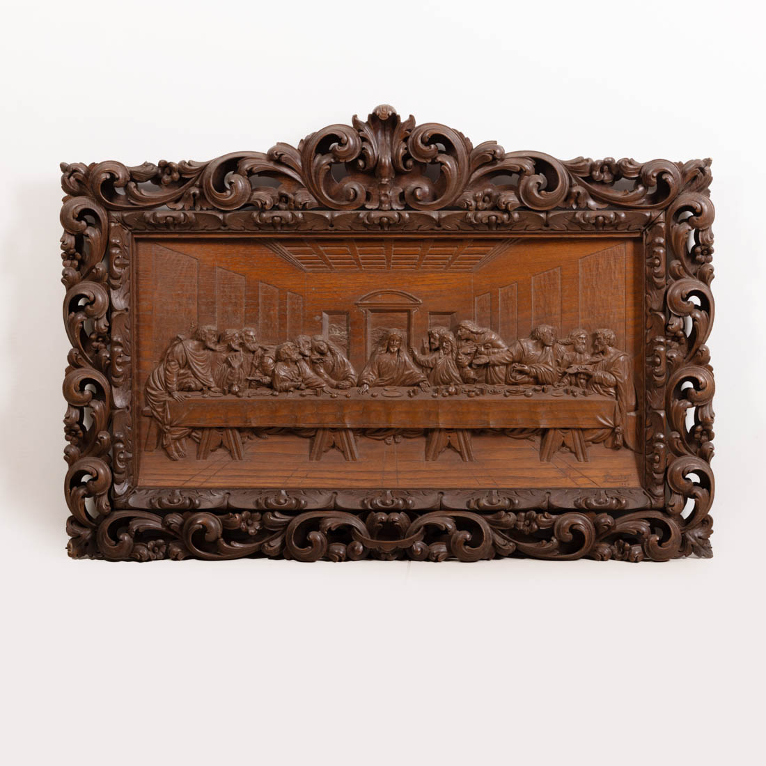 Retábulo em diferentes madeiras, moldura em castanho escurecido entalhado e vazado com elementos vegetalistas.