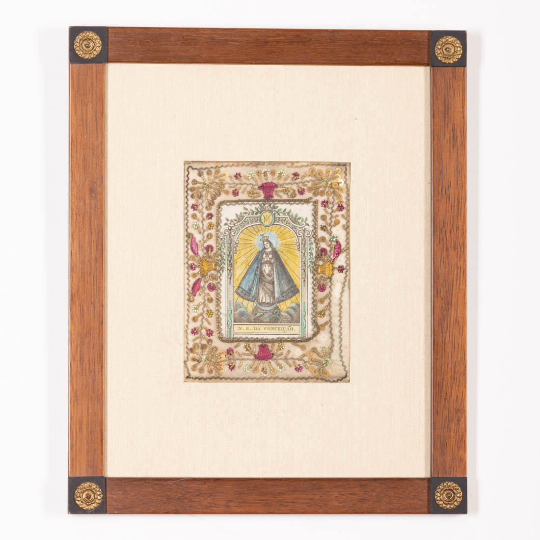 Litografia colorida sobre papel e bordado a fio de metal colorido. Pequenos defeitos.