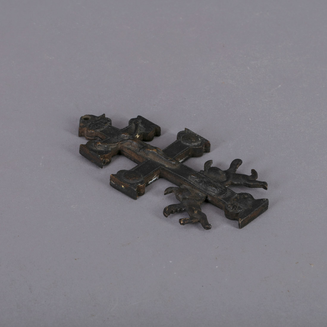 Em metal amarelo patinado, decoração relevada. Sinais de uso.