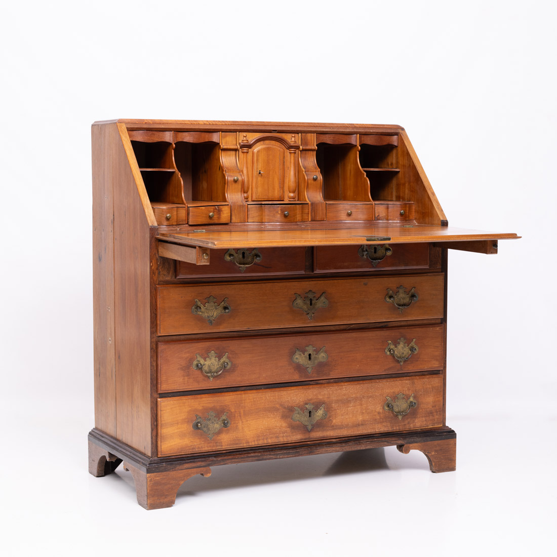 Em vinhático, de cinco gavetas, ferragens em metal amarelo, interior com escaninhos e gavetas. Pequenos defeitos, faltas e restauros.