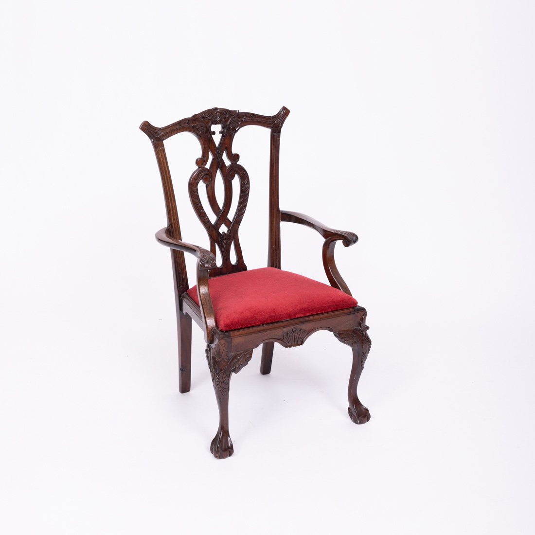 Estilo D. João V/D. José, em diferentes madeiras com entalhamentos, tabela vazada, assento estofado a tecido vermelho. Pequenos defeitos.