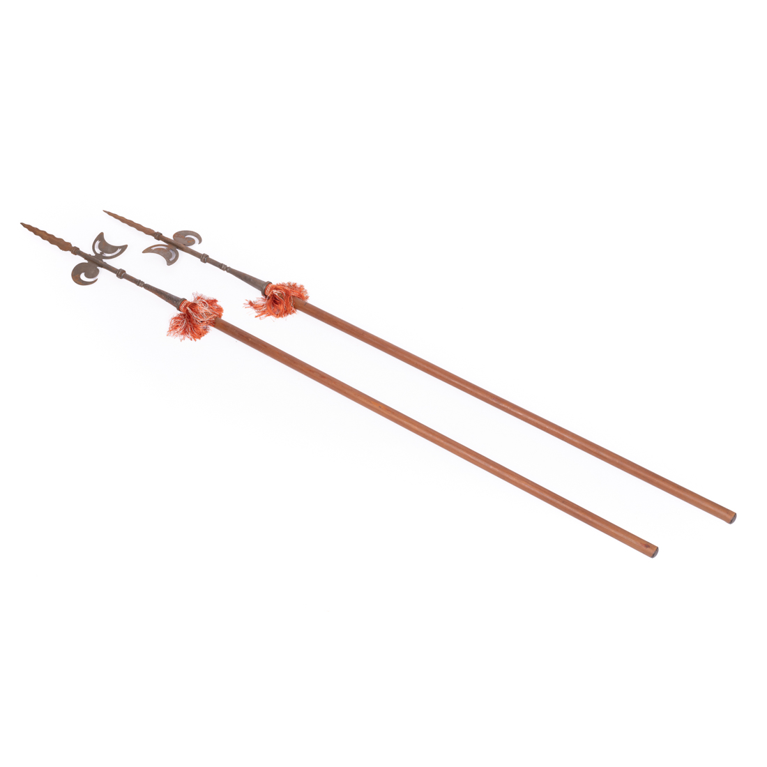 No estilo de Séc. XIV/XV, feitas nos finais do Séc. XIX ou mesmo XX. Interessantes lâminas a terminar em ponta flamejante. Chuços de madeira em bom estado com separador tipo cortinados. Muito decorativas. Bom estado.