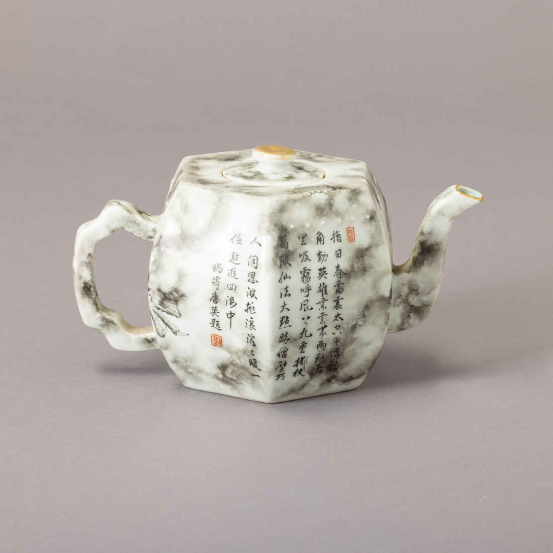 Em porcelana da China, decoração a grisaille e dourado com dragão e caracteres. Marcado. Sinais de uso.