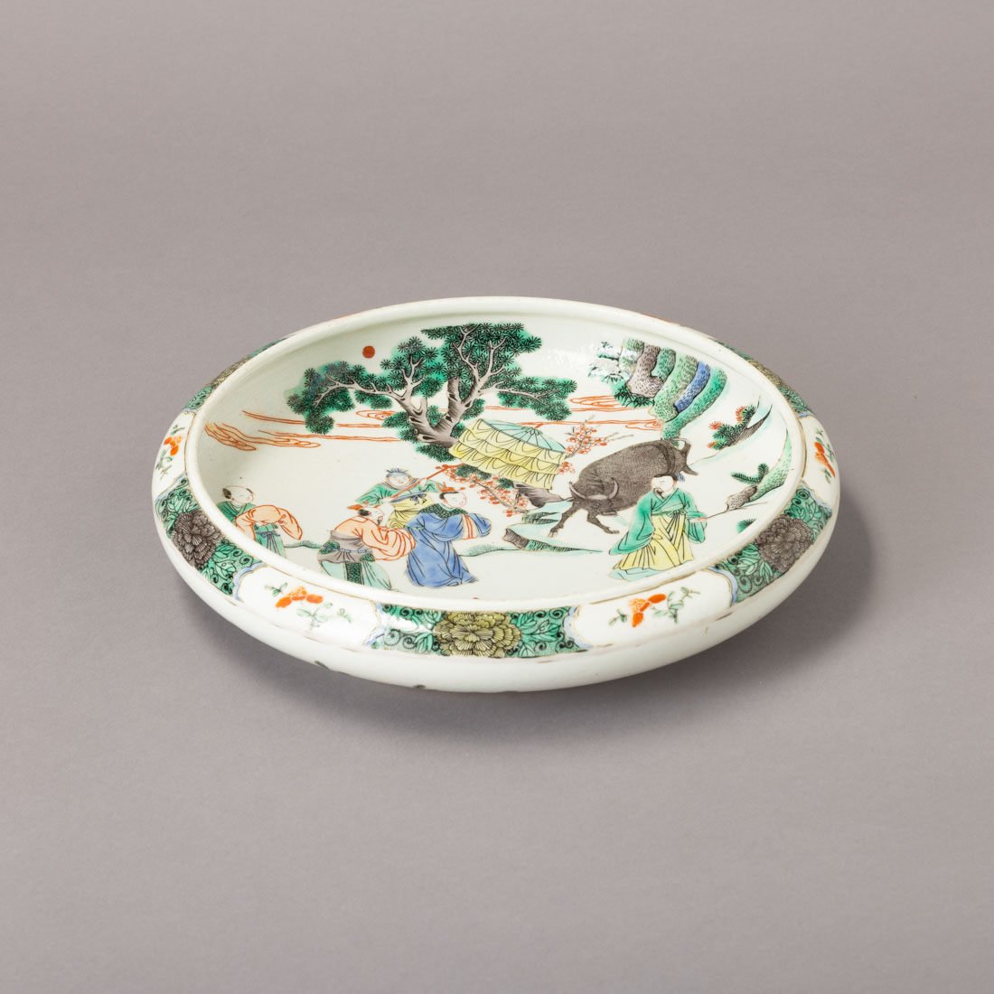 Em porcelana da China, decoração com esmaltes policromos da família verde com figuras da corte e animal. Marcada. Sinais de uso e leve desgaste.