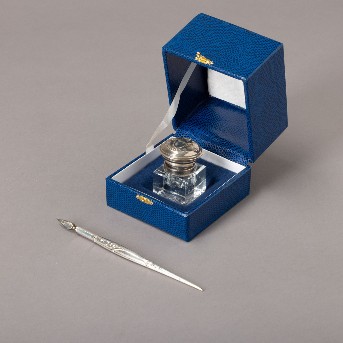 Tampa e pena em prata portuguesa contraste águia (pós 1985) de 925, decoração relevada, recipiente em vidro. Tinteiro com estojo. Sinais de uso.