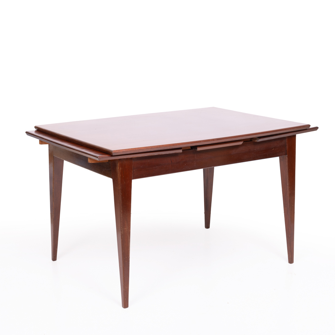 Em mogno e folheada a mogno, com duas tábuas de extensão inclusas. Anos 60/70. Nórdica. Sinais de uso, pequenos defeitos.