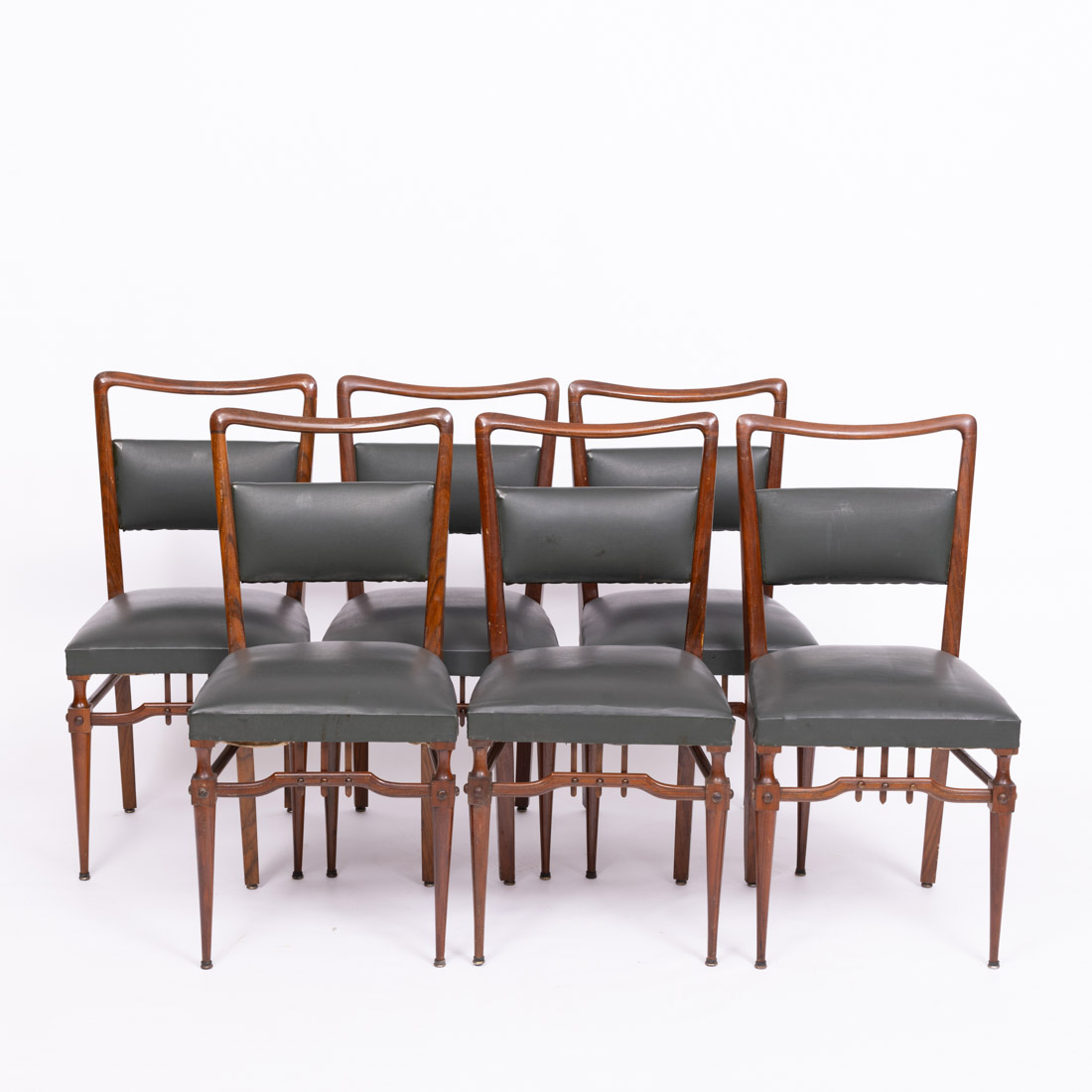 Em mogno, assentos e costas estofadas a napa verde. Anos 60/70. Nórdicas. Sinais de uso e pequenos defeitos.