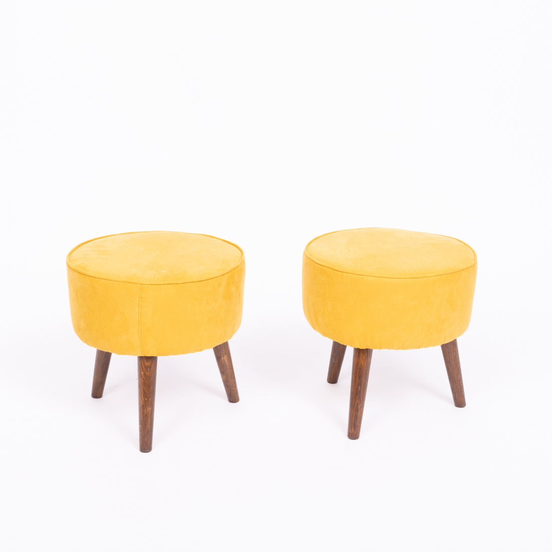 Estrutura em madeira, estofados a tecido de tom amarelo torrado. Sinais de uso.