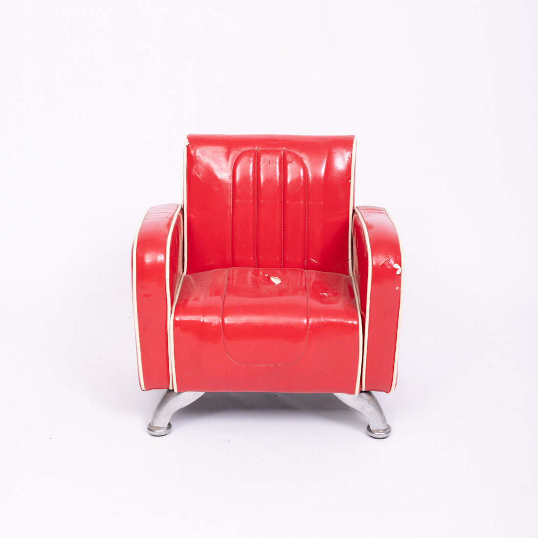 Estofado a napa vermelha, rematado a bege, pés em metal cromado. Anos 50. pequenas falhas e defeitos.