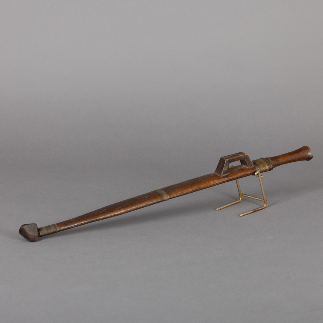 Punho e bainha em madeira, parcialmente revestido a fio de cobre, lamina em ferro, Moçambique. Pequenos defeitos, oxidações.