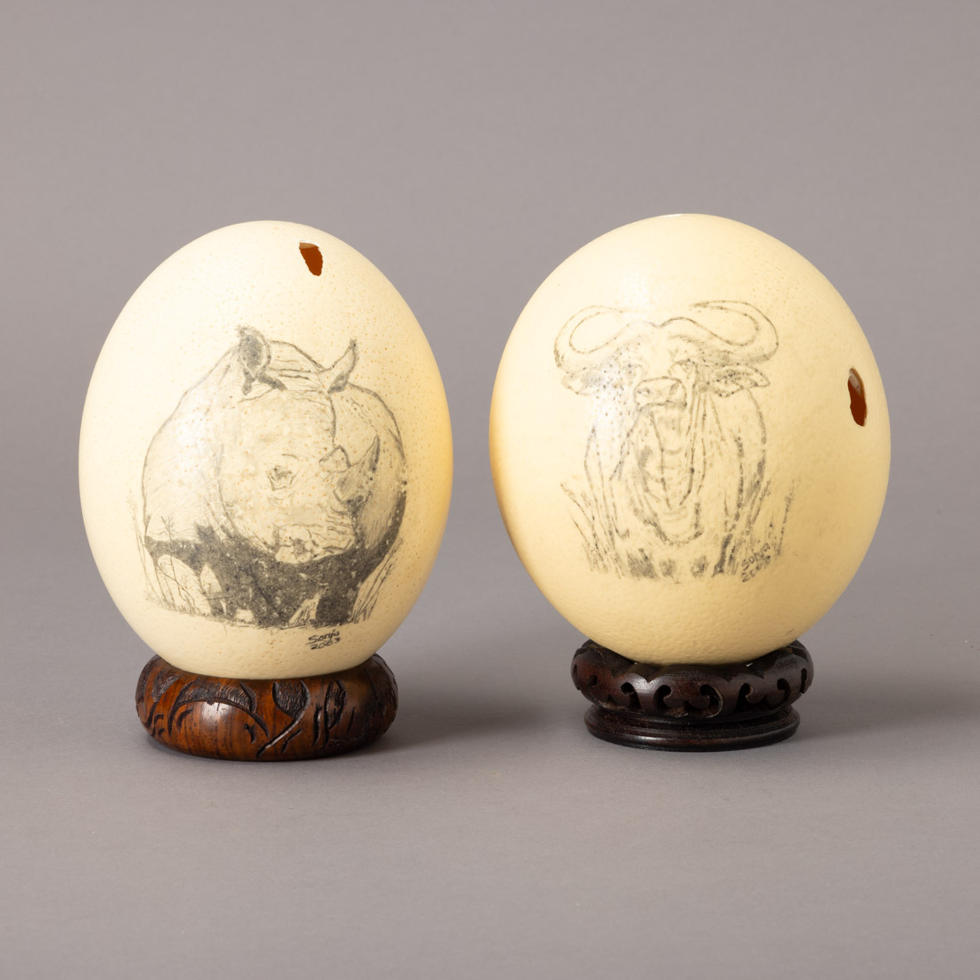Pintados com rinoceronte e búfalo, assinados e datados 2003. Um com base em madeira exótica entalhada. África. Sinais de uso, defeitos.