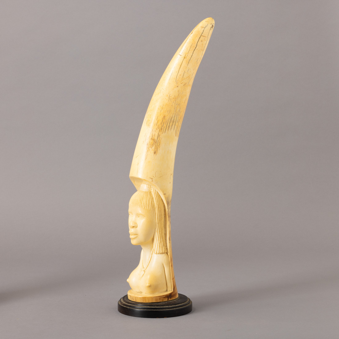 Escultura em marfim. Base em madeira. Arte Africana anos 50.