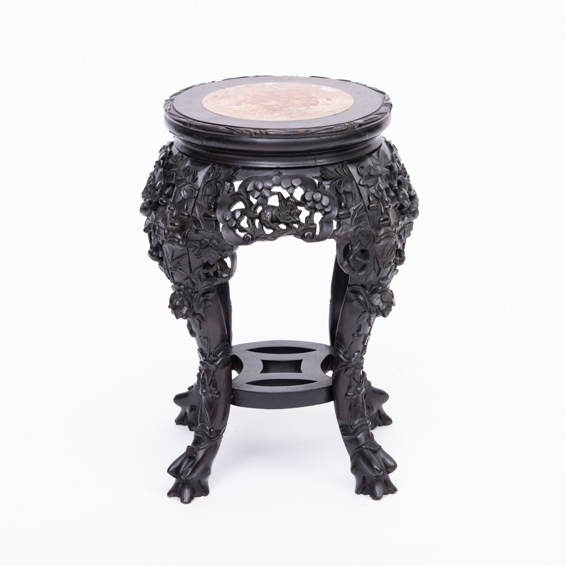 Em madeira exótica entalhada e vazada, decoração com elementos vegetalistas e animais, tampo redondo em mármore. Pequenos defeitos.