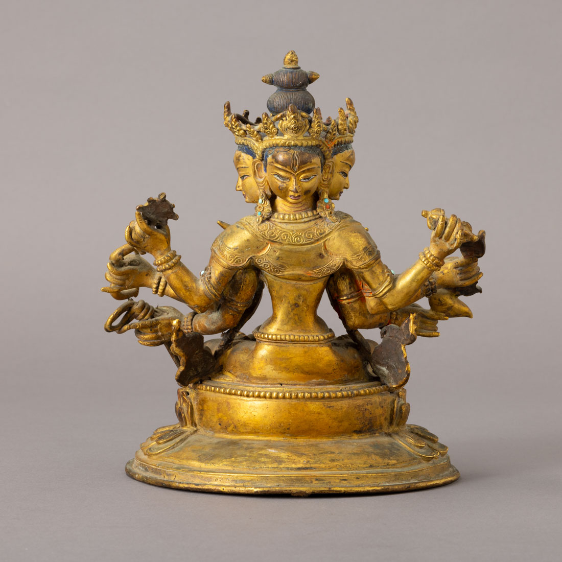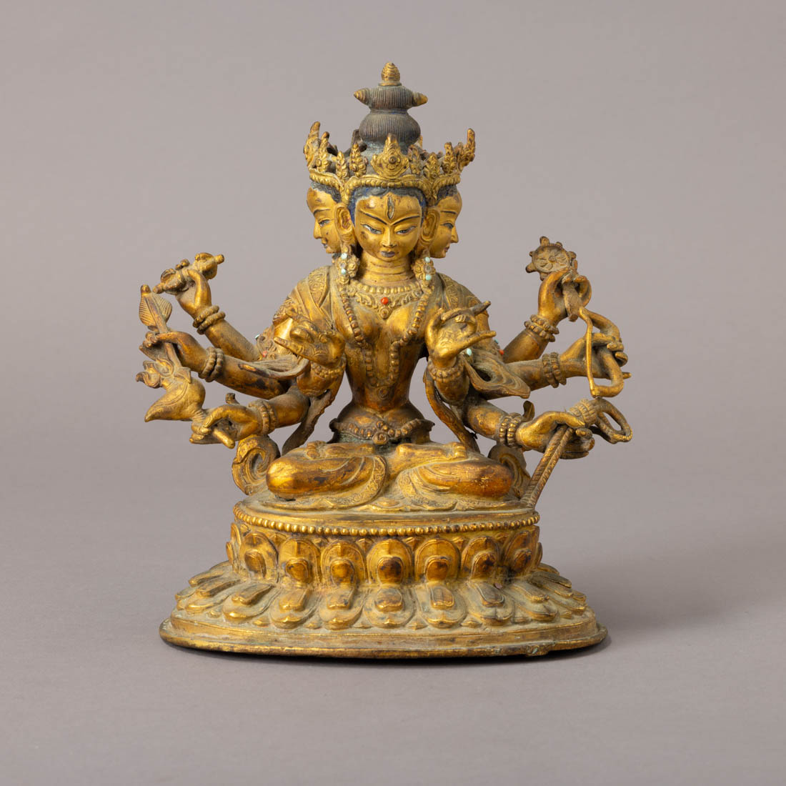 Escultura em bronze dourado, aplicação de pedras, representada sobre trono de lótus. Pequenos defeitos.