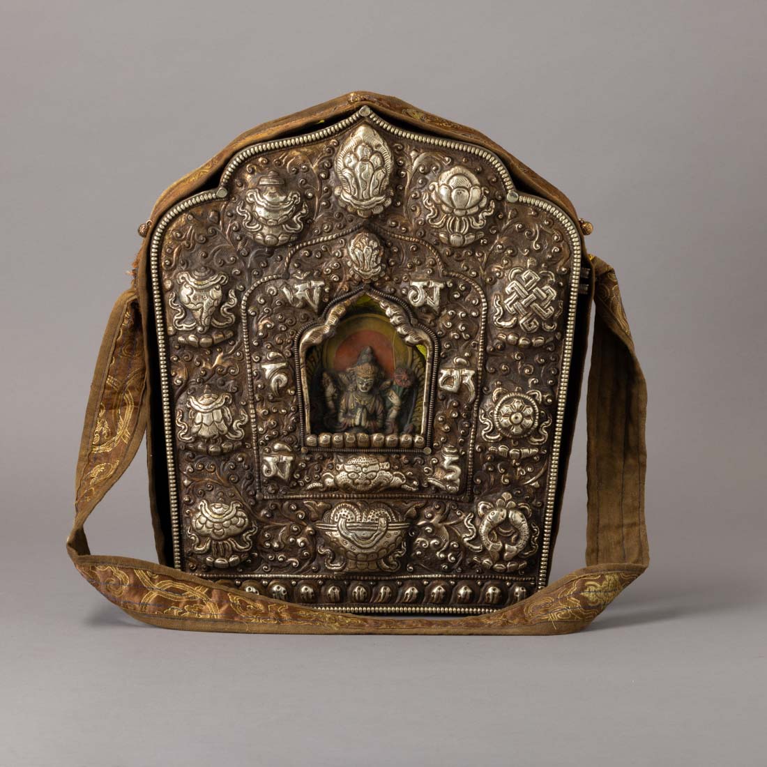 Em metal prateado e outros materiais, decoração relevada, no interior escultura de buda. Tibetano. Pequenas falhas e defeitos.