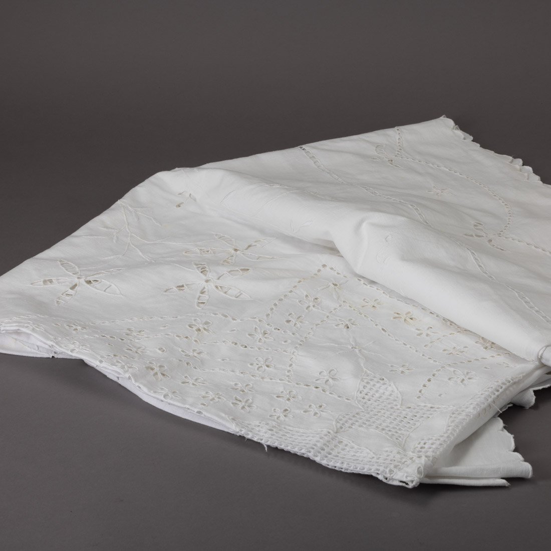 Em linho bordado. Pequenas manchas e pequenos defeitos.