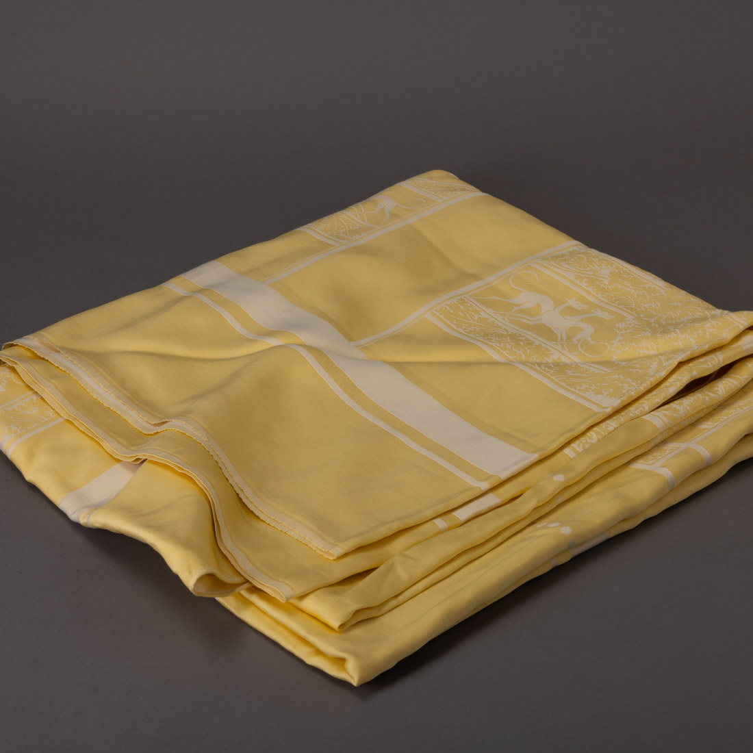 Em tecido adamascado amarelo e branco, decoração com veados e galgos. Sinais de uso e pequenas manchas.