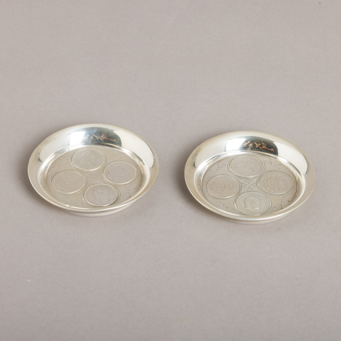 Em prata portuguesa contraste águia (1938-1984) de 916 - 1º. Título, marcada Mergulhão - Lisboa, decoração gravada e aplicação de quatro moedas de 200 Reis. Sinais de uso, leves amolgadelas.