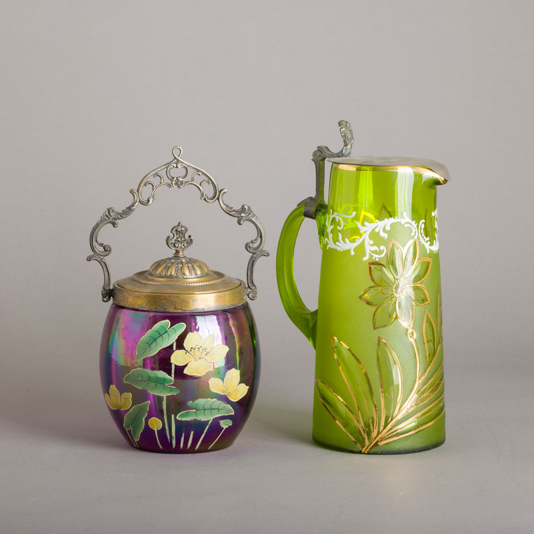 Em vidro colorido pintado, decoração policromada "flores" tampas e asas em metal prateado. Séc. XIX/XX. Sinais de uso, biscoiteira com desgaste.