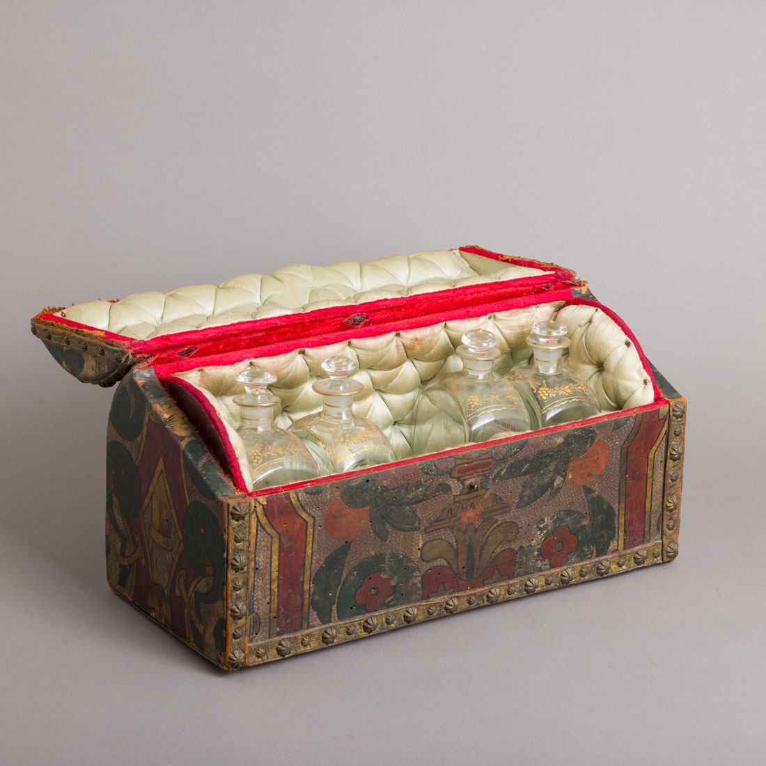 Em madeira revestida a pele pintada, decoração policromada e dourada, com pregaria, interior forrado a tecido "capitonné". Frascos em vidro, decoração dourada "flores". Séc. XVIII/XIX. Duas tampas com defeitos, falhas, defeitos e vestígios de xilófagosDim. Baú: 22,5x45x20 frascos: 19 cm.
