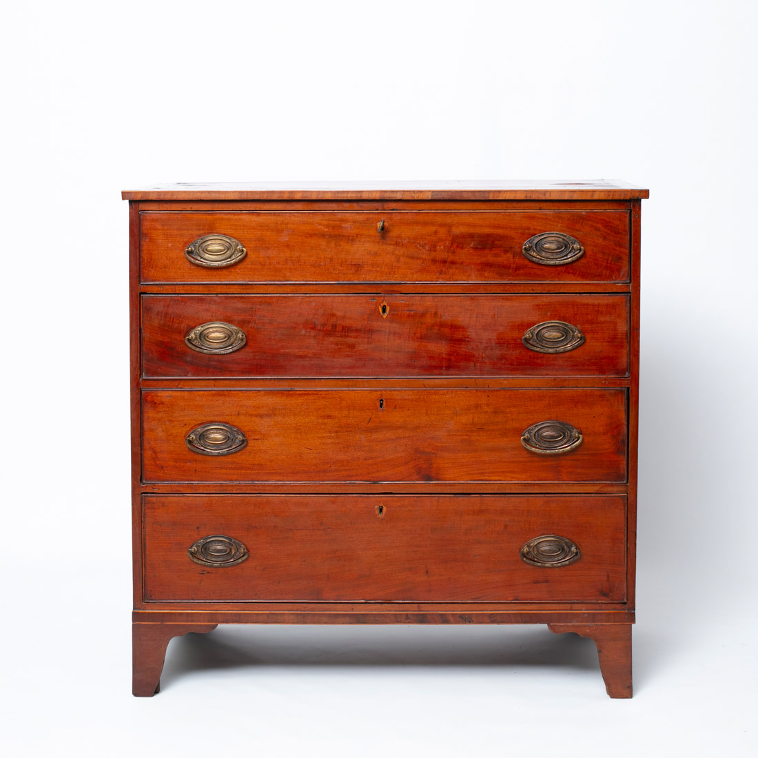 Em mogno e folheada a mogno, de quatro gavetões, puxadores em metal amarelo. Pequenas falhas e defeitos.