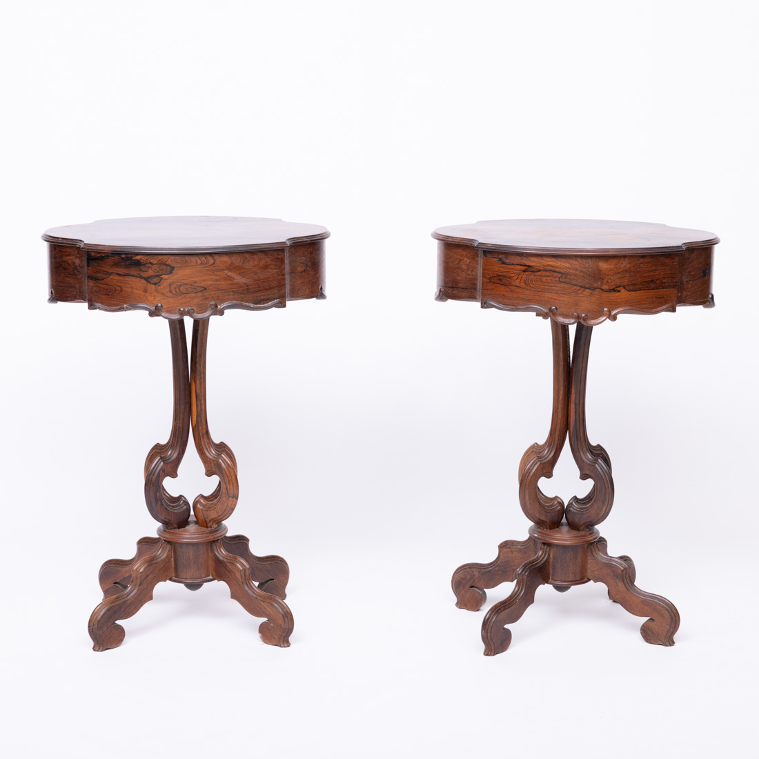 Em pau santo com entalhamentos, tampo recortado, pernas curvas e pés com enrolamentos. Pequenas falhas e pequenos defeitos.