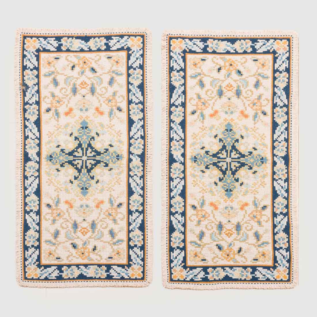 Bordados a fio de lã, decoração policromada com motivos vegetalistas. Etiqueta "Casa dos Tapetes de Arraiolos". Sinais de uso.