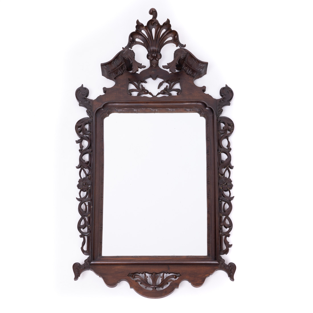 Estilo D. José, moldura castanho e outras madeiras escurecidas, entalhada e vazada. Falhas e pequenos defeitos.