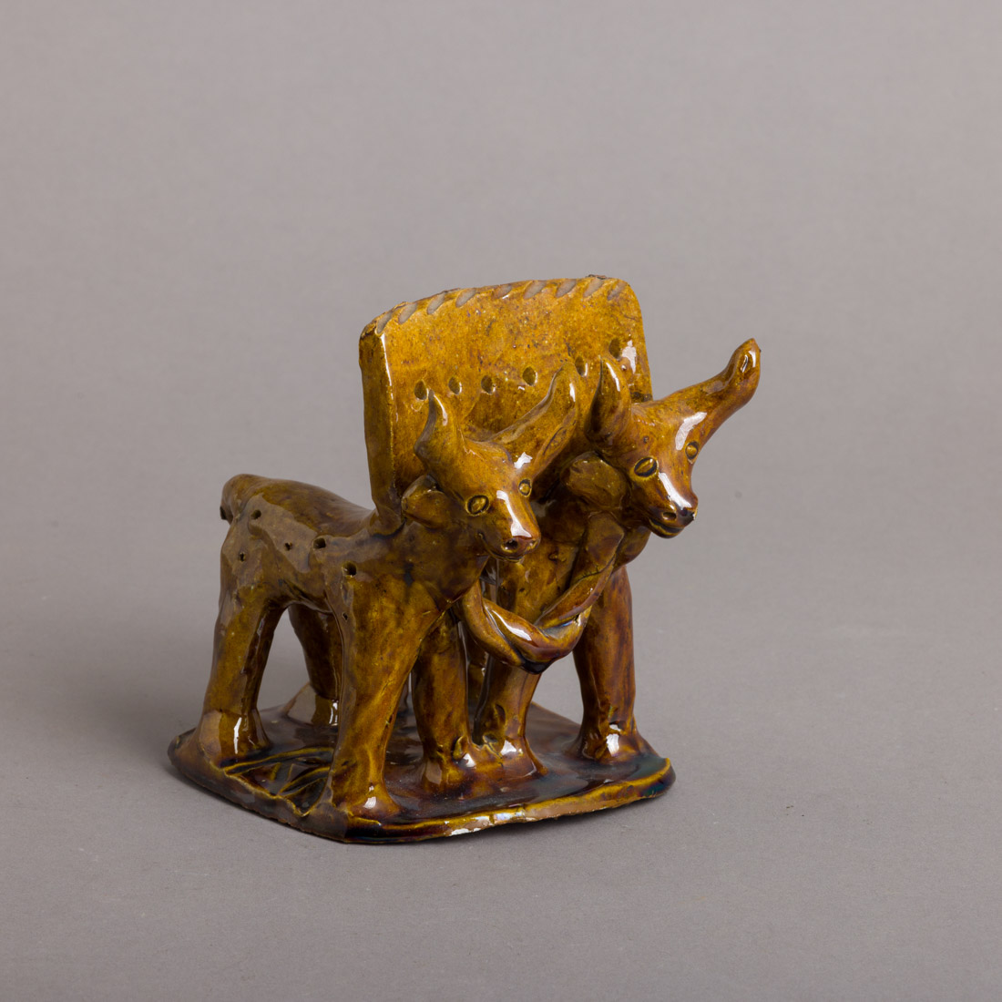 Escultura em barro vidrado, decoração monocroma, assinada. Sinais de uso.