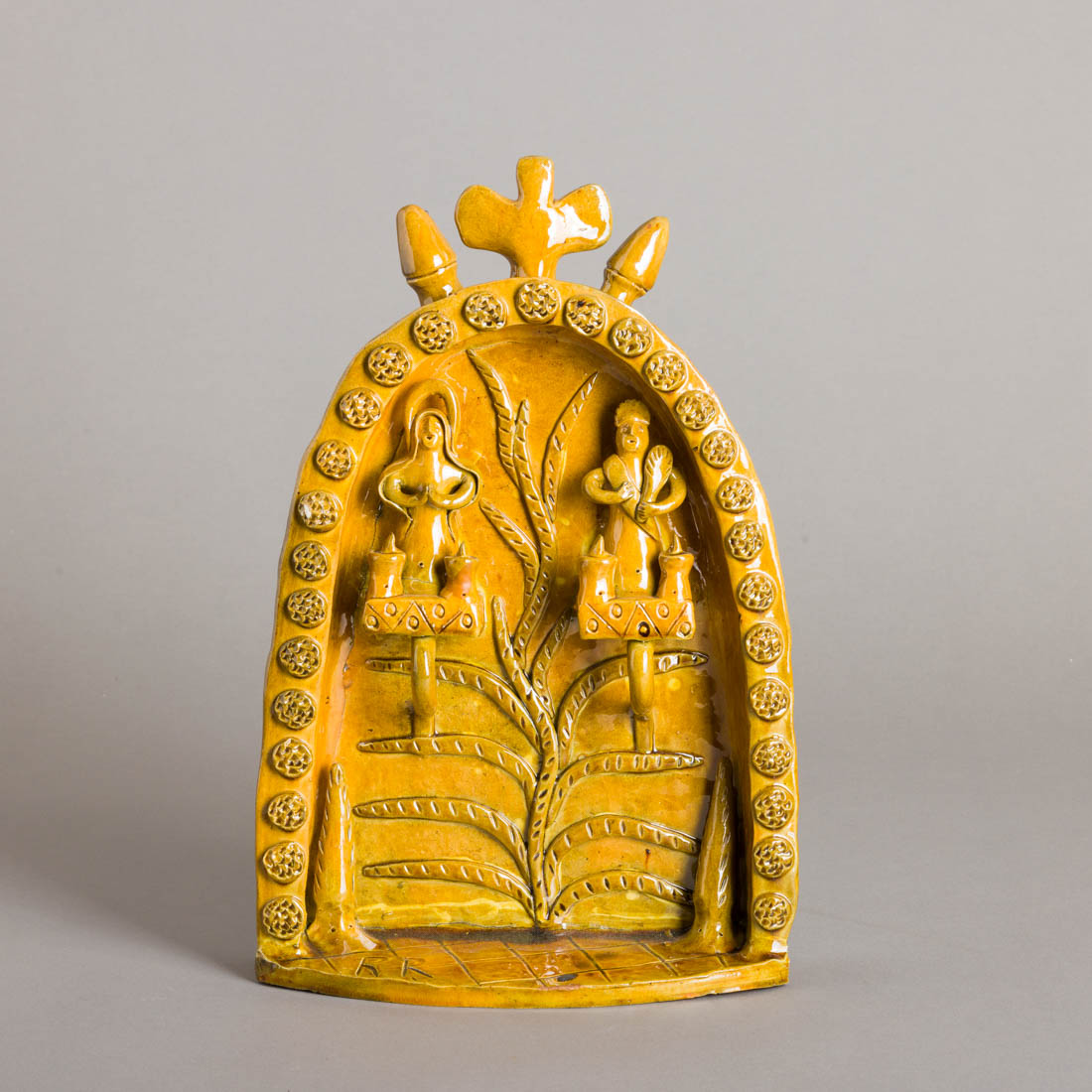 Escultura em barro vidrado, decoração monocroma, assinada. Sinais de uso e duas pequenas falhas no vidrado do verso.