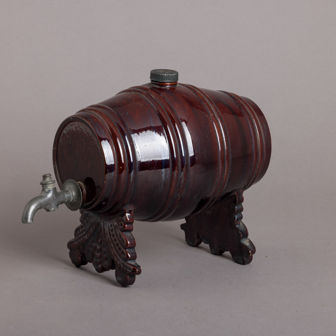 Em cerâmica vidrada, decoração relevada monocroma a castanho. Pequenas esbeiçadelas, falhas nos pés, defeito na torneira e falta tampa.