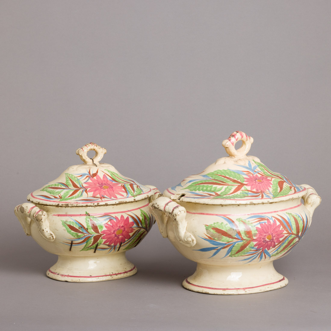 Em faiança portuguesa, decoração policromada "flores". Séc. XIX/XX. Desgaste no vidrado, esbeiçadelas, uma cabelos gateados e pomo da tampa partida presa com arame.