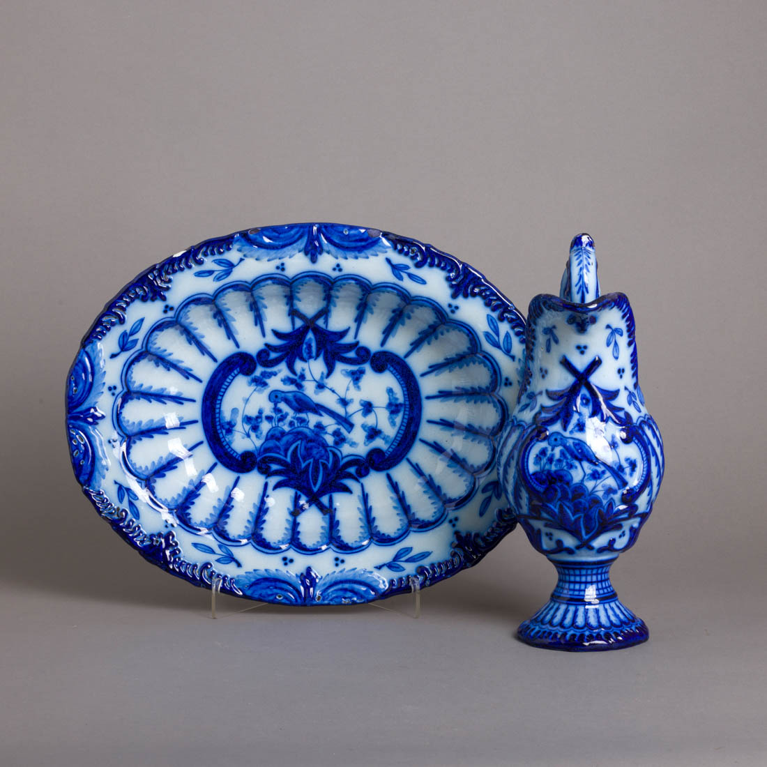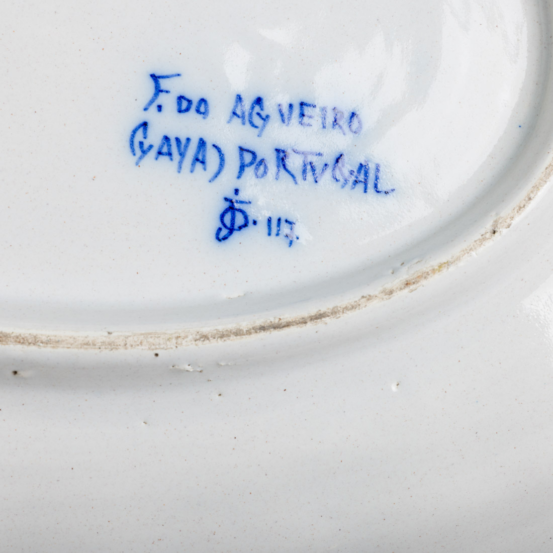Em faiança portuguesa da Fábrica do Agueiro, Gaya, decoração relevada a azul "pássaro e elementos vegetalistas". Séc.. XX. Esbeiçadelas, ligeiro desgaste no vidrado e cabelo na pega.