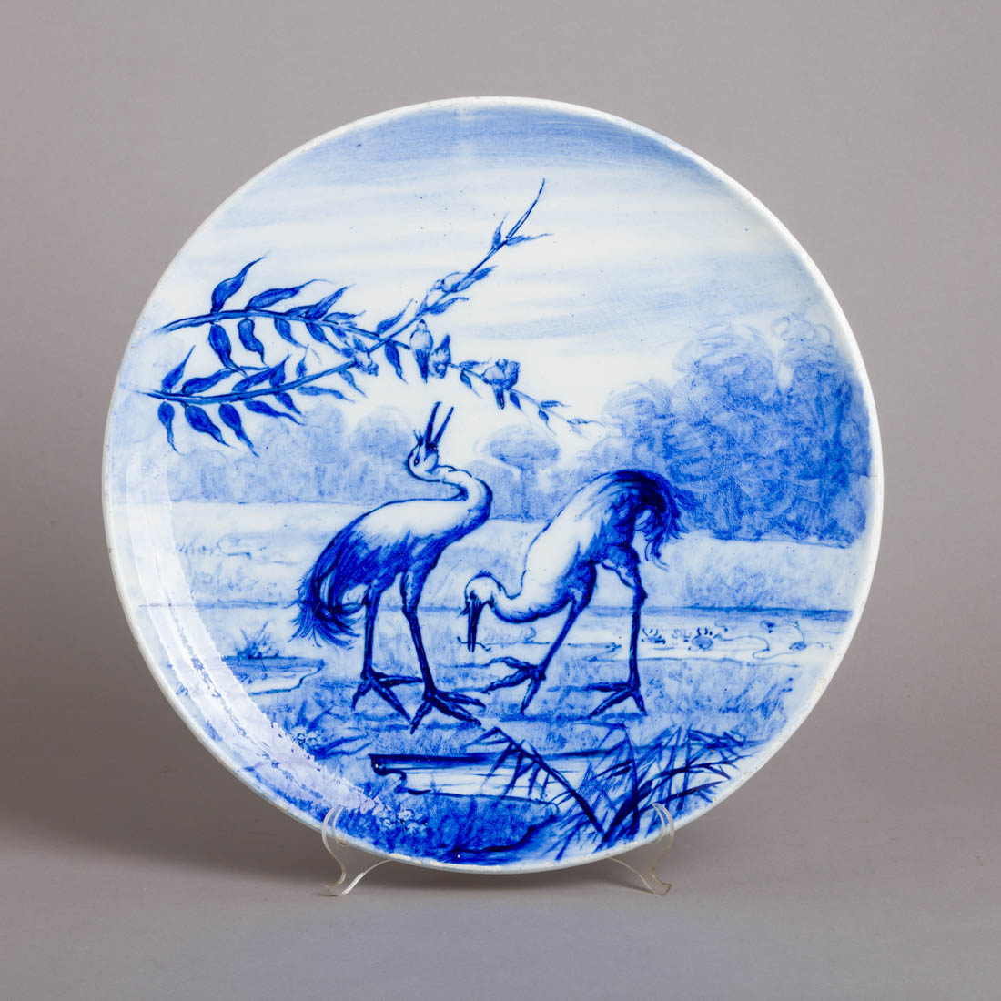 Em faiança, decoração a azul "paisagem com cegonha e pássaros no ramo". Desgaste no vidrado e esbeiçadelas.