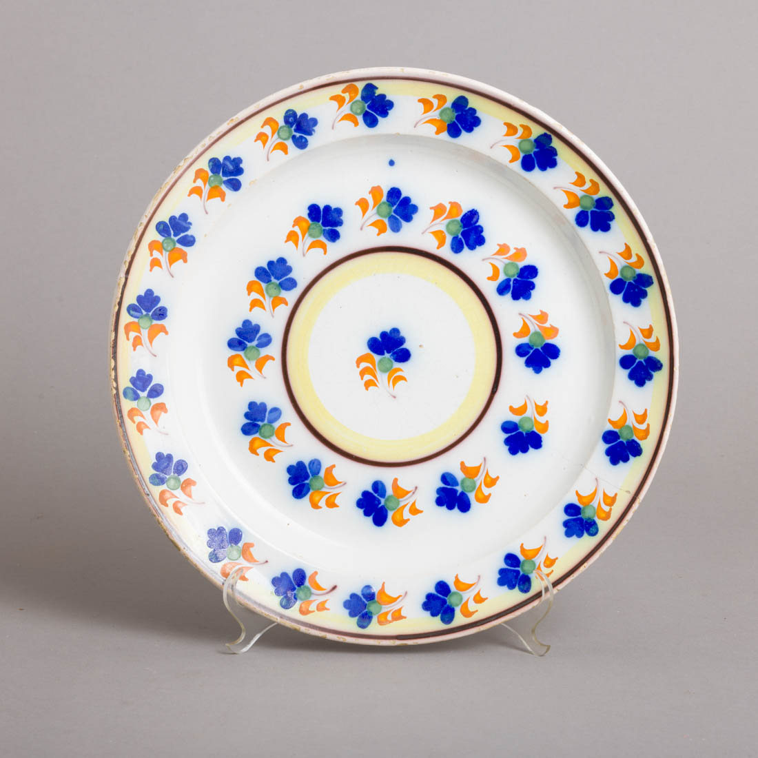 Em faiança portuguesa, decoração policromada "flores". Séc. XIX. Cabelos, desgaste no vidrado e craquelé.