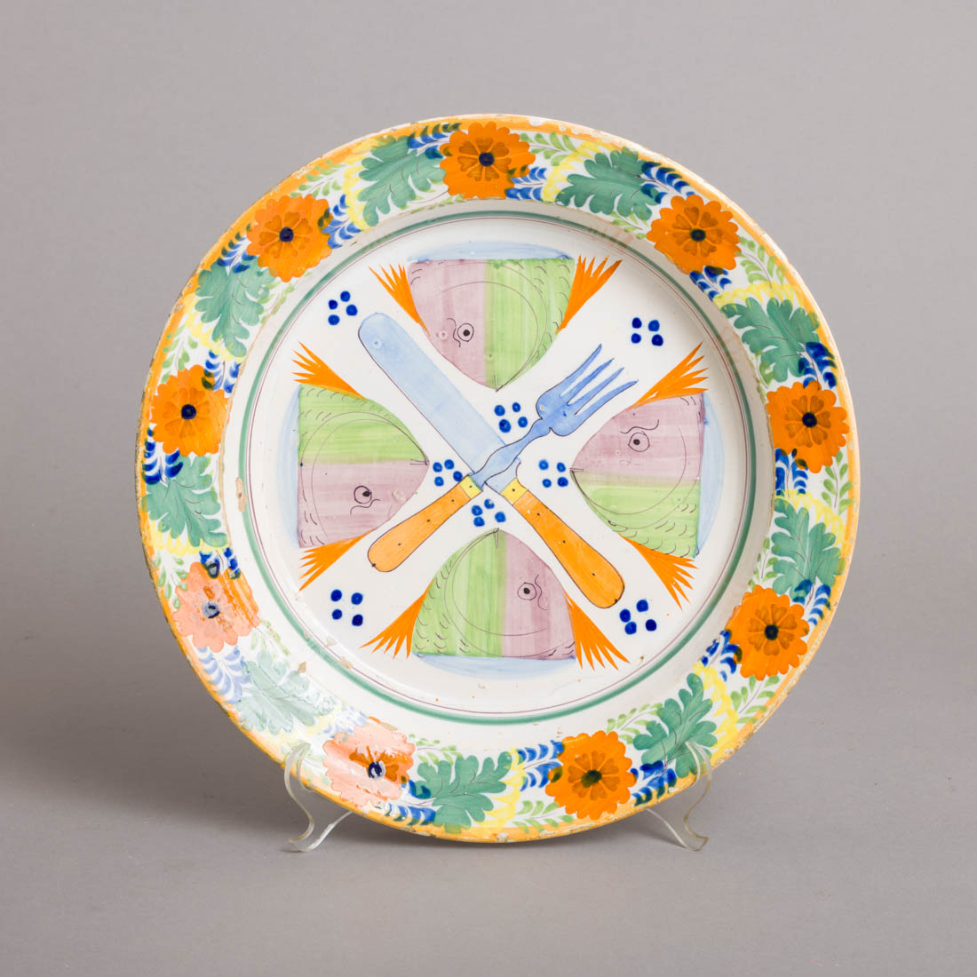 Em faiança portuguesa, decoração policromada "cabeças de peixe e talheres". Séc. XIX. Esbeiçadelas, desgaste no vidrado e cabelos gateados.