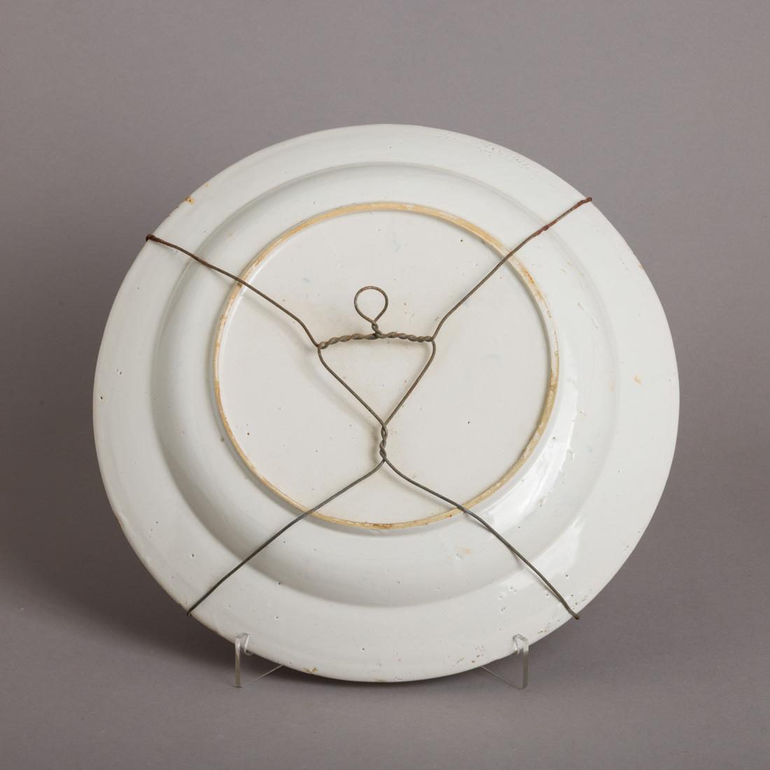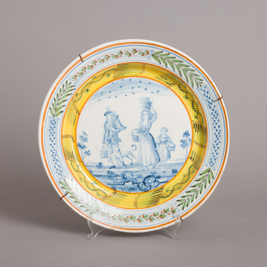 Em faiança, decoração policromada "Paisagem com figuras" na aba elementos vegetalistas. Pequenas esbeiçadelas e grande cabelo circular.