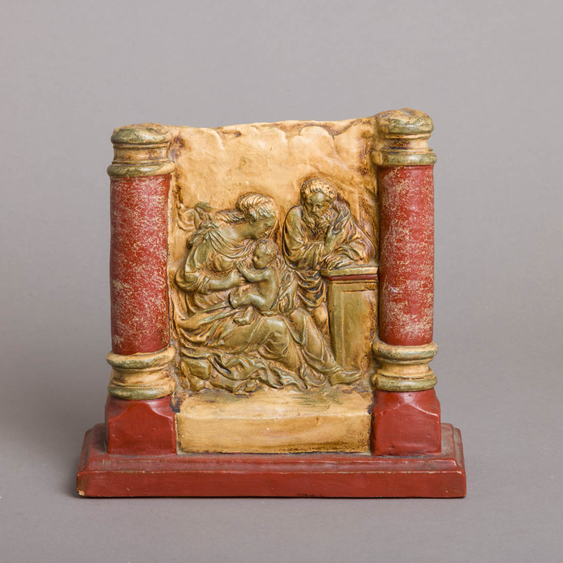Em terracota, decoração relevada e policromada. Sinais de uso.
