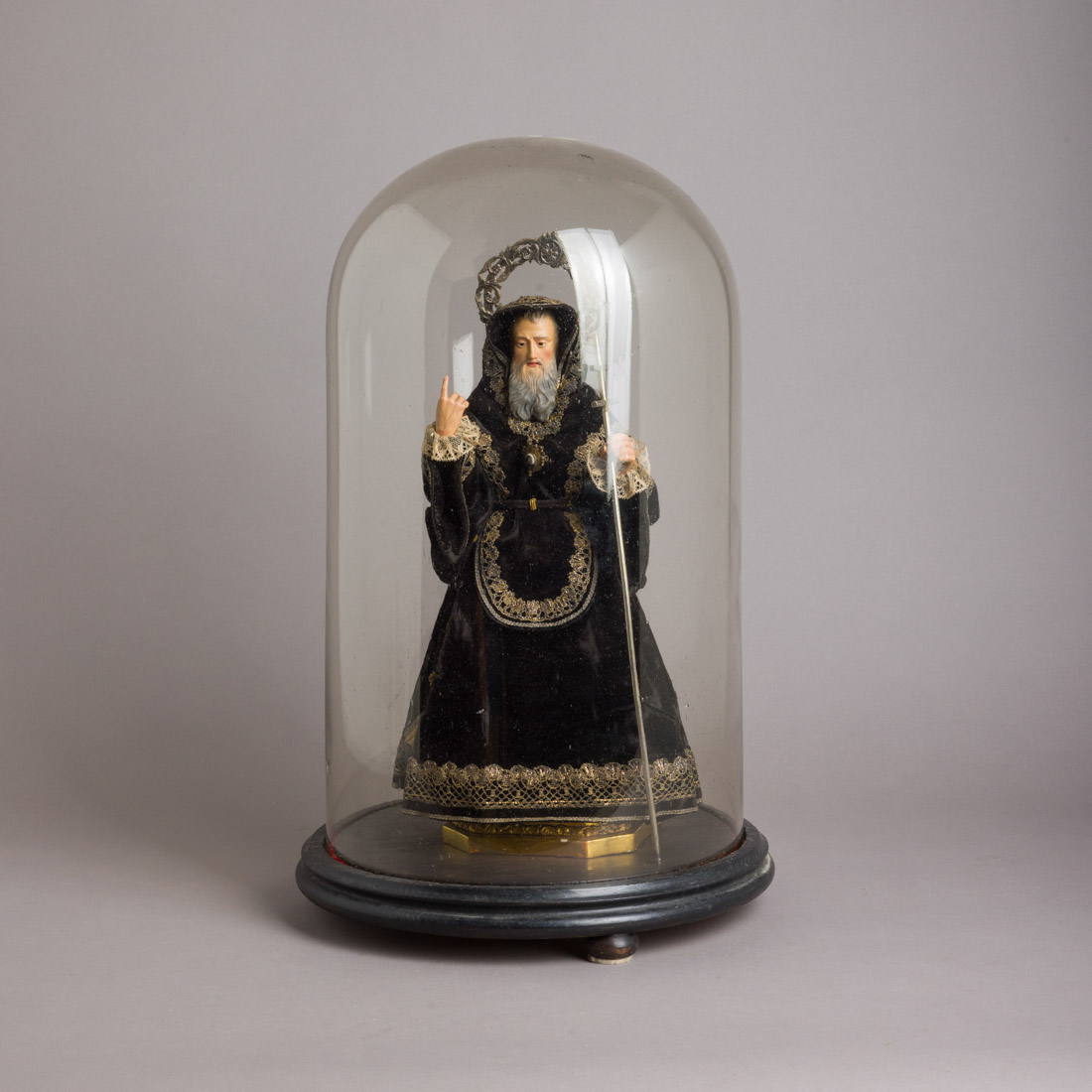 Escultura de roca em madeira policromada, olhos de vidro, vestes em veludo com galões dourados (falhas), peanha em madeira dourada, com atributos. Séc. XVIII/XIX. Redoma em vidro e base em madeira escurecida. Pequenos defeitos. Dim. Imagem: 37 cm. Redoma:55 cm.