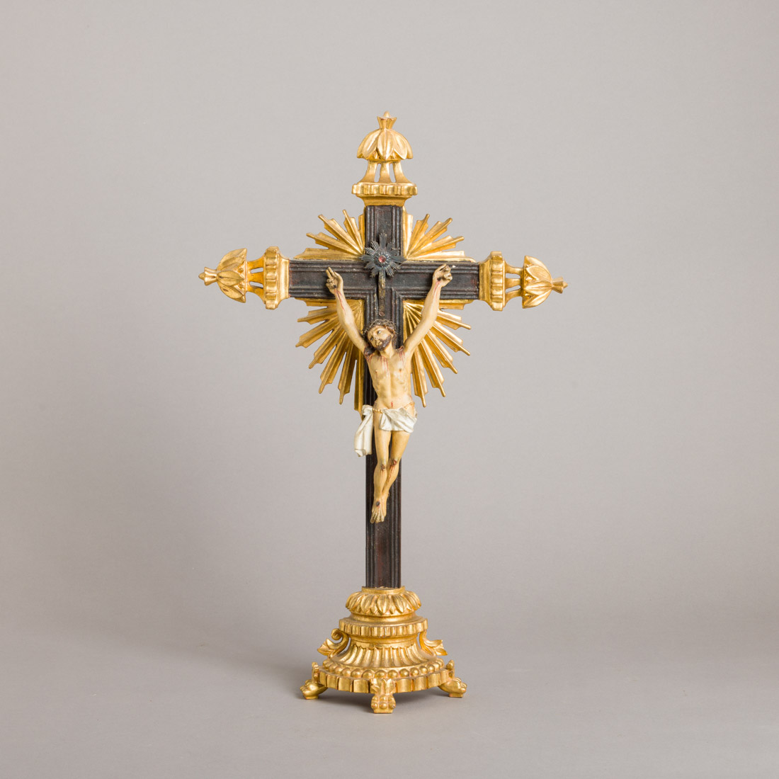 Escultura em madeira policromada, olhos de vidro, cruz em madeira pintada com entalhamentos dourados. Séc. XIX. Resplendor datado 1869 e coroa de espinhos em prata sem marcas, ao abrigo do D/L.n.º 120/2017. Pequenas falhas. Dim. Cristo: 18 cm Total: 51 cm