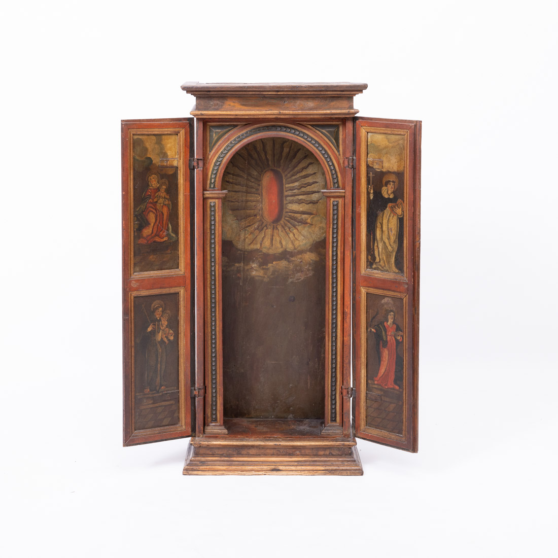 Em madeira, interior pintado com friso entalhado, interior das portas pintadas "Nossa Senhora com o Menino" e "Santo António com o Menino", "São Domingos" e "Santa Mártire". Pequenas falhas e defeitos.