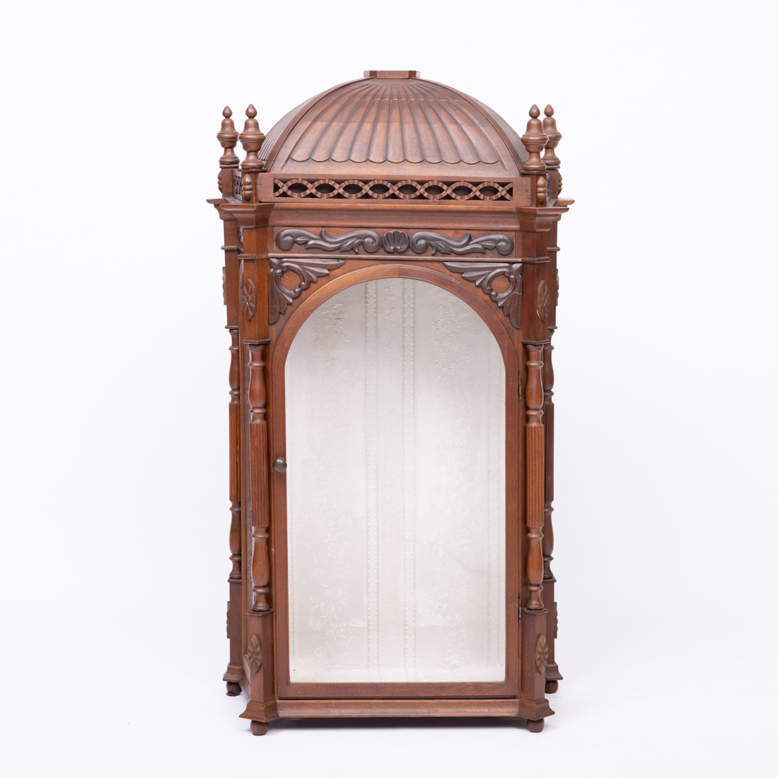 Estilo D. Maria, em diferentes madeiras com entalhamentos, cúpula gomada, porta e laterais envidraçados. Séc. XIX. Pequenos defeitos.