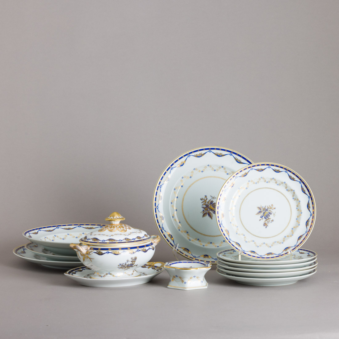 Em porcelana moldada (1992-1997) decoração a azul e a dourado "Fontainebleau". Composto por um prato raso, um fundo, dois de sobremesa e seis de bolo. Sinais de uso.
