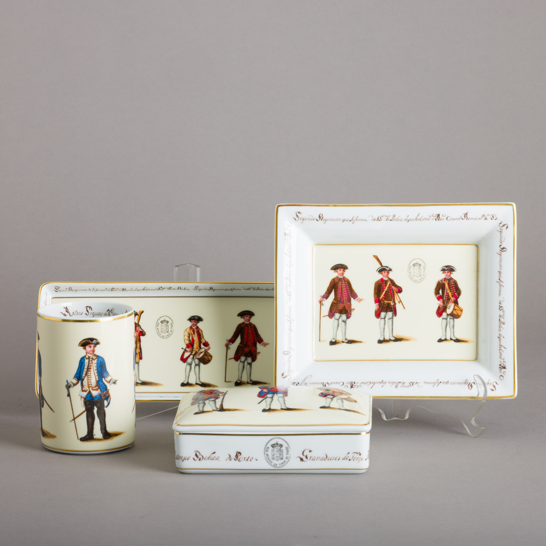 Em porcelana moldada (2004), decoração policromada e dourada com militares "Real Archivo da Torre do Tombo". Sinais de uso.