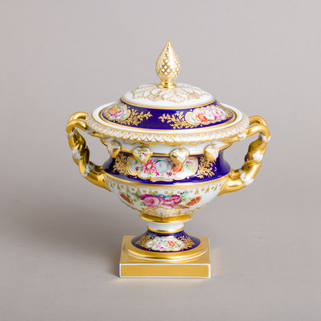 Em porcelana moldada e relevada (2005), decoração policromada e dourada com reservas "flores" sobre fundo azul. Sinais de uso.