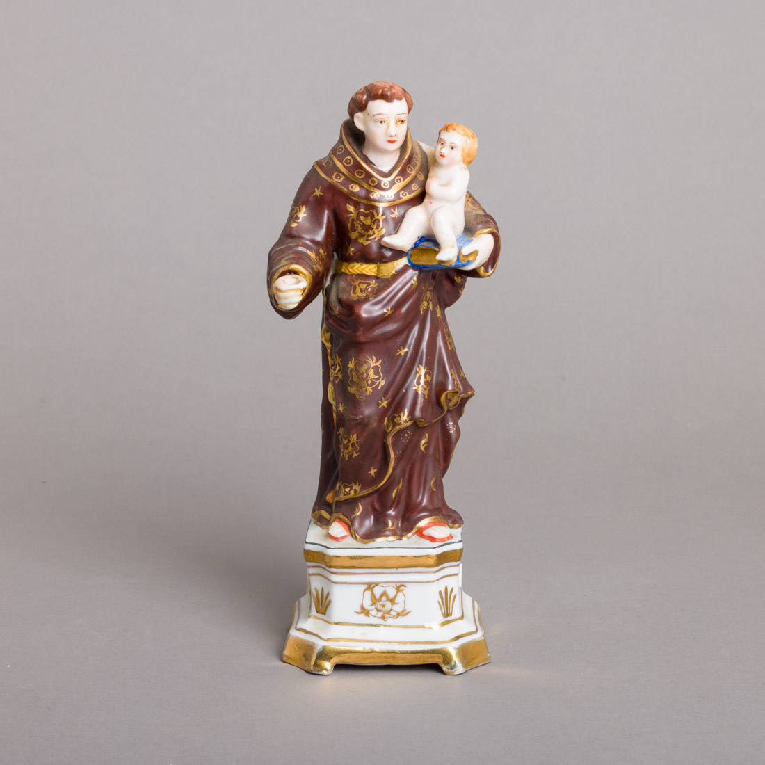 Escultura em porcelana moldada (1924-1947), decoração policromada e dourada. Leve desgaste.