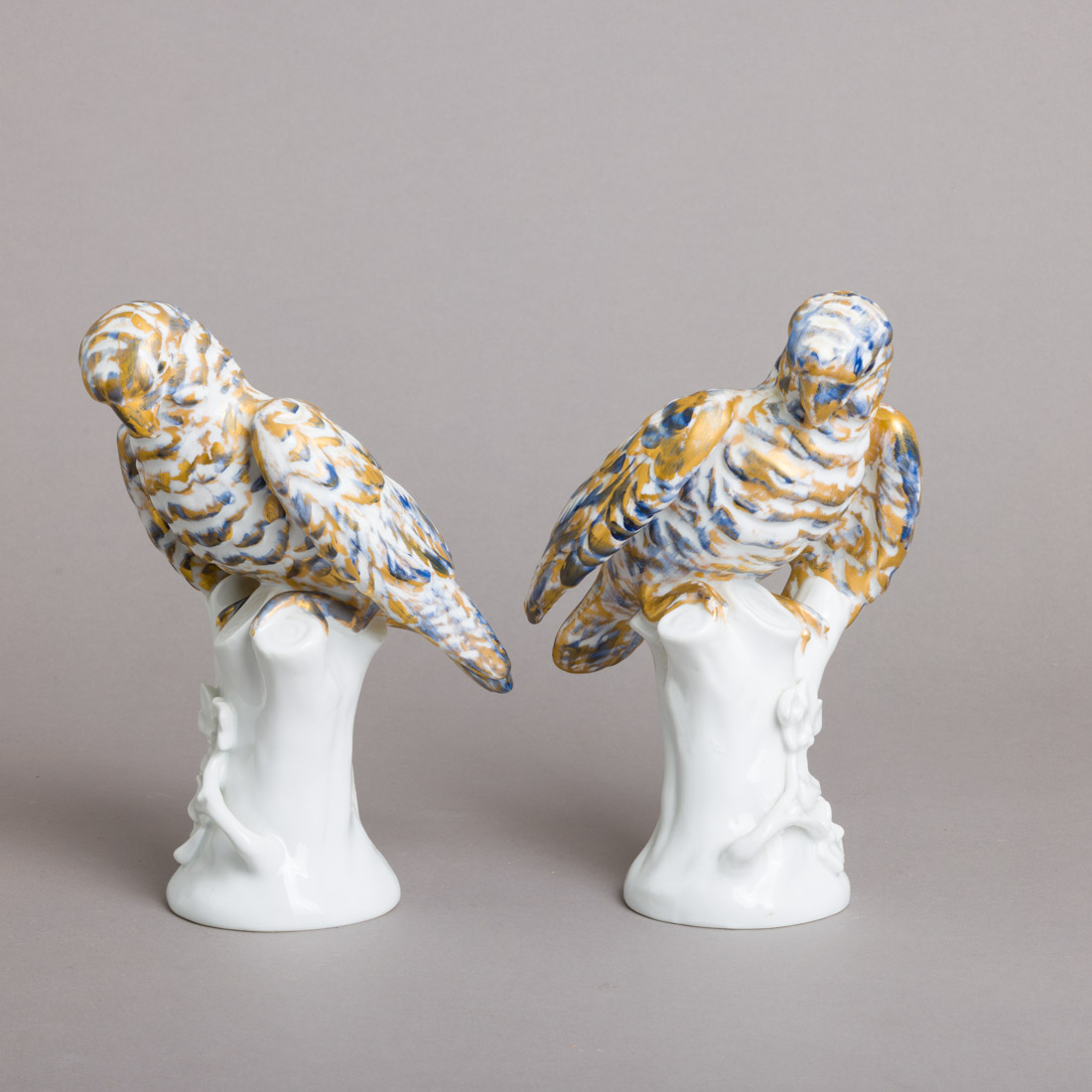 Esculturas em porcelana moldada (1947-1968), decoração a azul e dourado. Sinais de uso.
